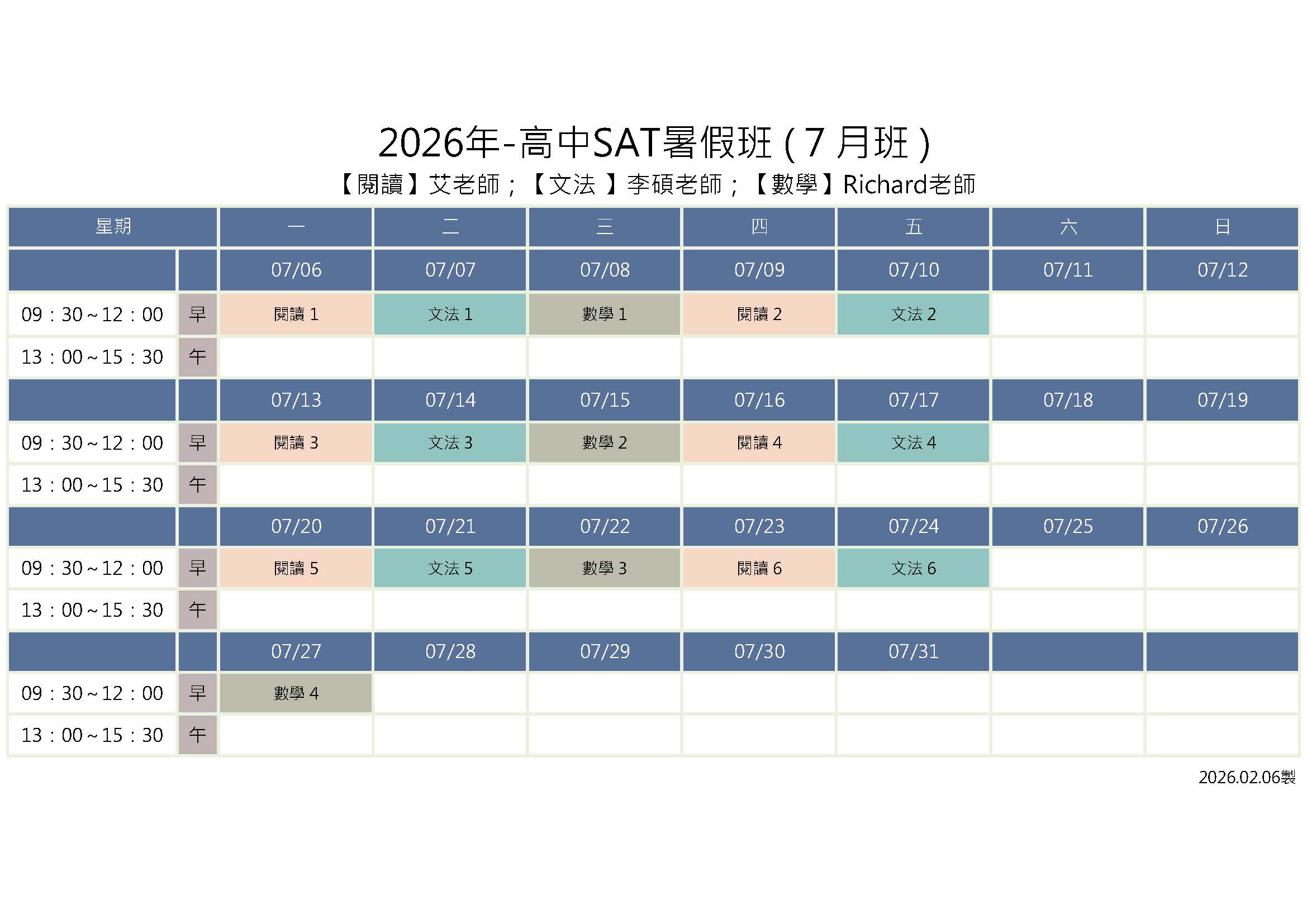 【SAT】2026年SAT暑假課表-7月 - 字神帝國英語學院 :: WordGod English Institute
