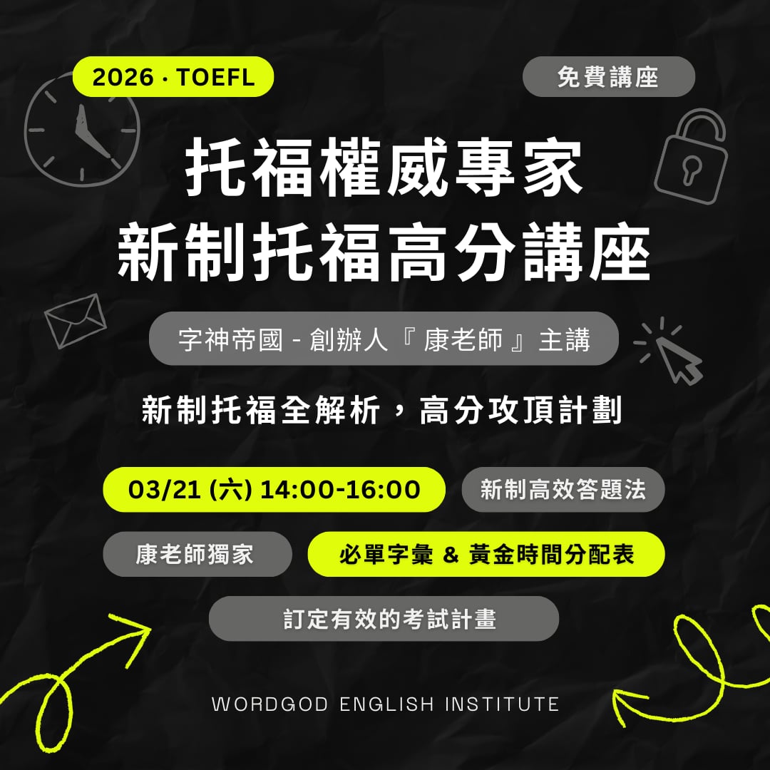 主題:字神帝國 – 康老師 2026 新托福備戰講座