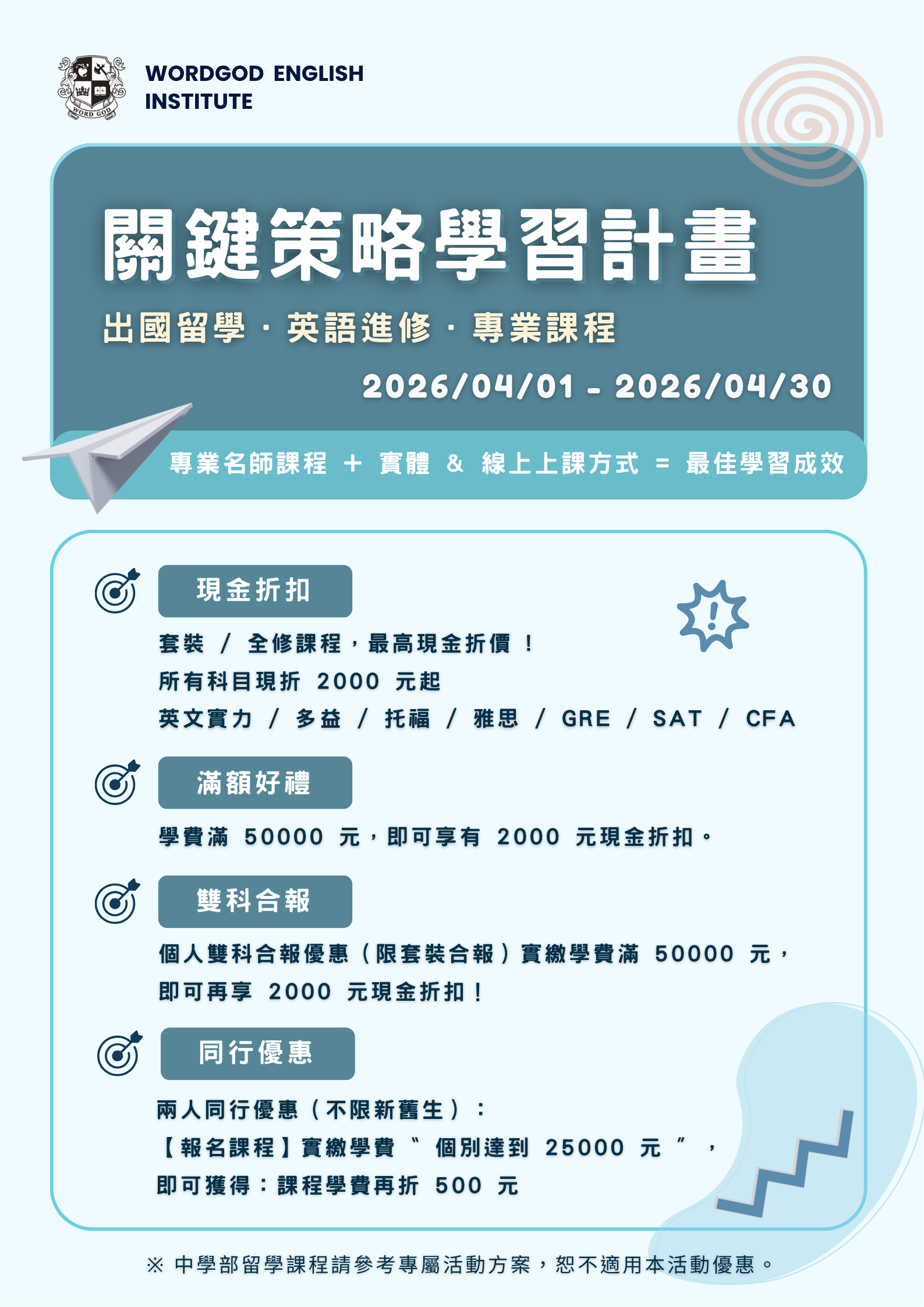 ※ 中學部留學課程請參考專屬活動方案,恕不適用本活動優惠。