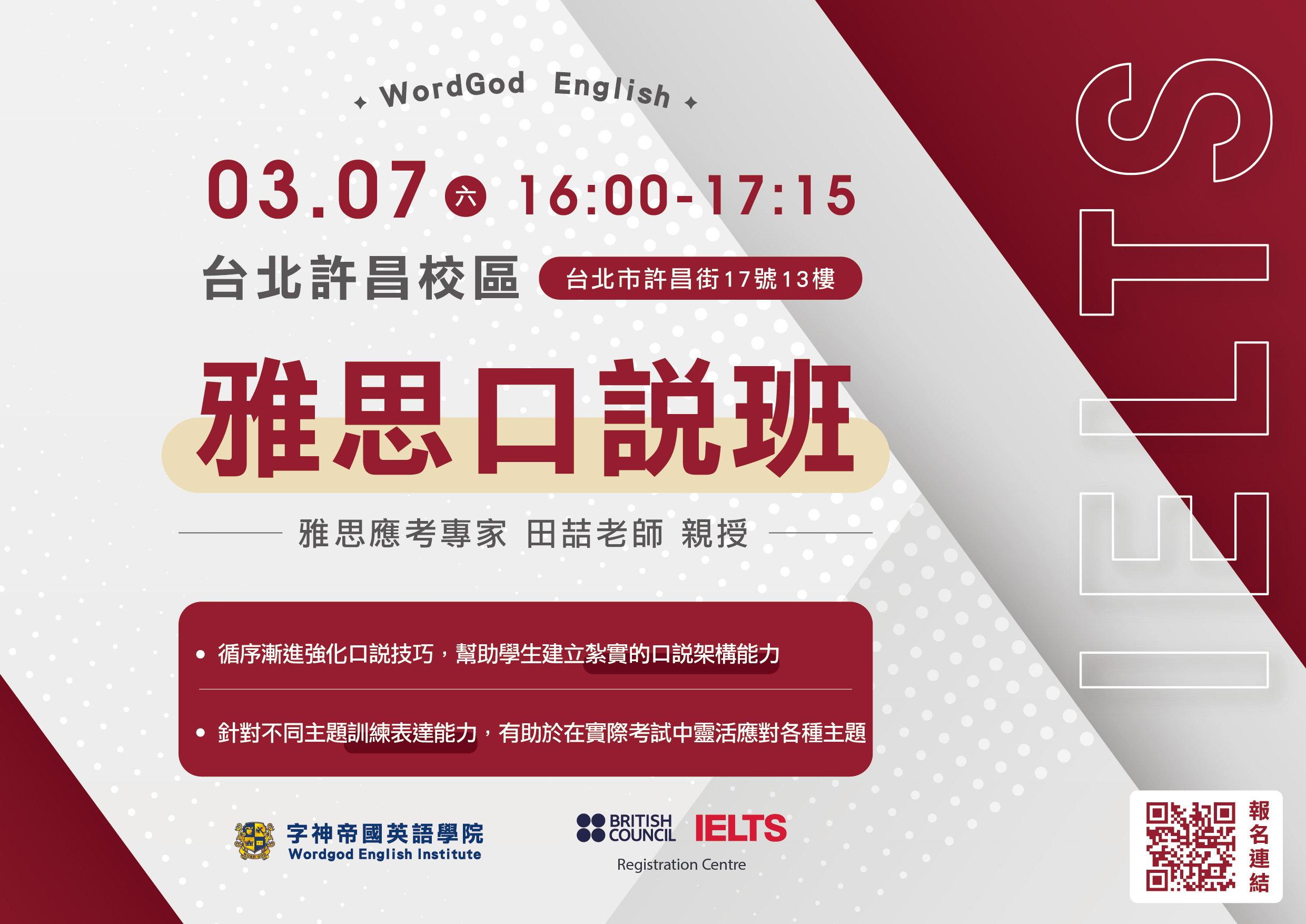 試聽地點:台北許昌分校 ( 台北市許昌街17號13樓 )